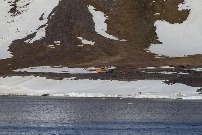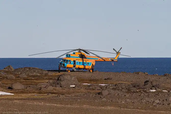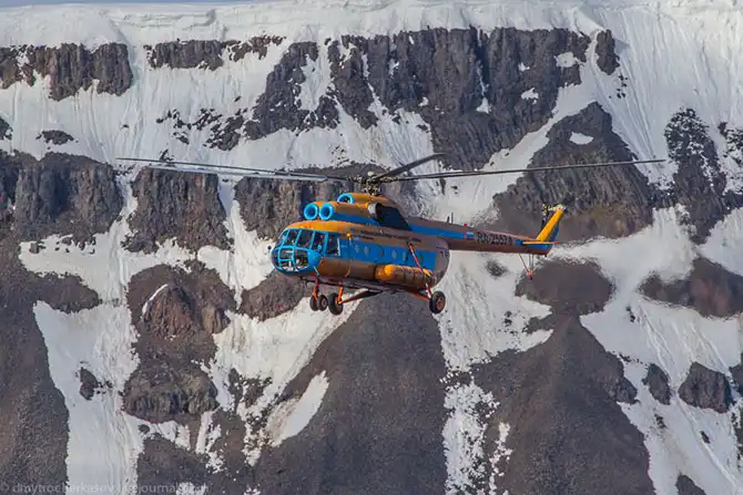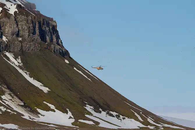 Рядом с местом высадки возвышается 300-метровый склон горы. На нем гнездятся тысячи птиц. В основном это кайры и белые чайки. Черные точки вокруг вертолета — это как раз птицы в воздухе.