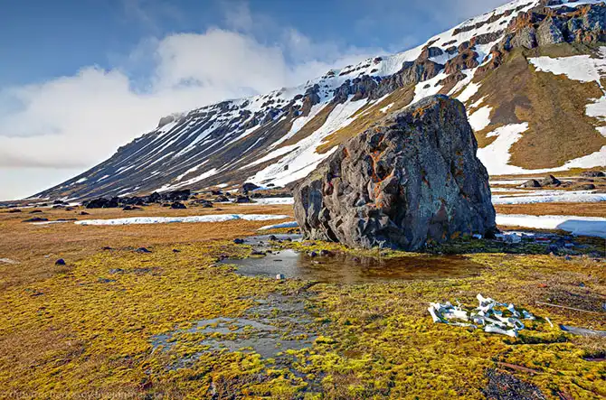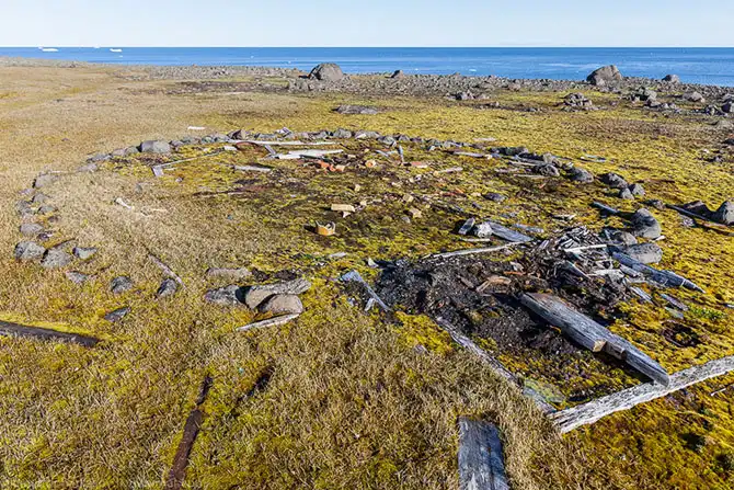 Заходят сюда и белые медведи. На островах также встречается песец, морж, нерпа, морской заяц, гренландский тюлень, нарвал и белуха. Немного южнее в море можно встретить касаток. Но в это посещение нам не довелось увидеть никаких животных. Только старые кости.