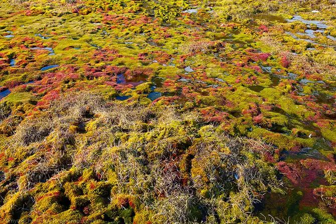 Базальтовые склоны острова все усеяны птицами. Также интересно наблюдать за структурой скалы, которая кажется собранной из отдельных ровных столбиков.