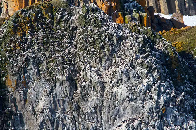 Они гнездятся буквально везде на этих базальтовых скалах. Только ледники свободны от птичьих поселений.