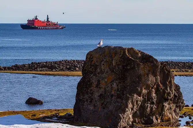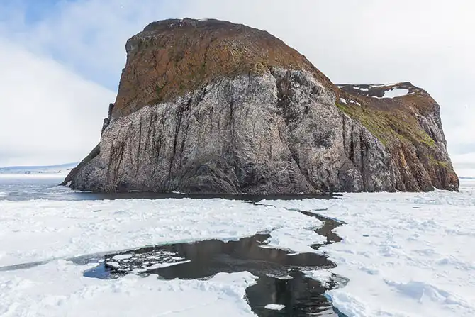 Благодаря вулканическому происхождению берег вокруг скалы очень крутой. Поэтому даже такое огромное судно, как наш атомный ледокол, способно подойти к ней практически вплотную. Это очень впечатляющее зрелище. Для того, чтобы руководить такой деликатной операцией, на носу находится один из матросов с переносной рацией. Он постоянно сообщает расстояние до скалы и тенденцию движения.