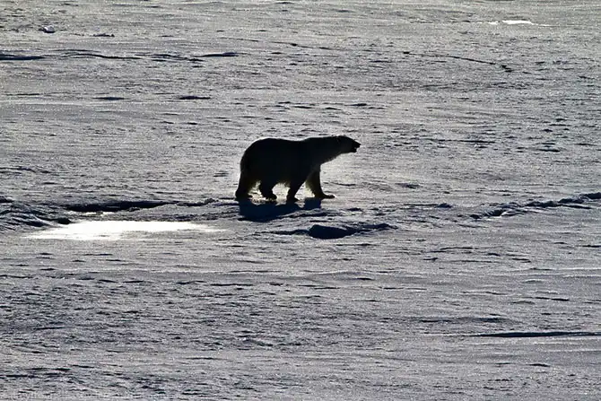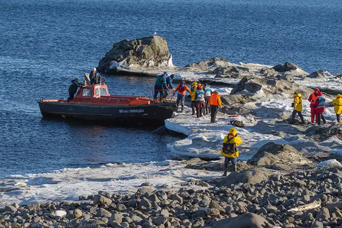 Первыми на берег высаживаются люди, обеспечивающие безопасность остальной группы. Охота на белого медведя запрещена по закону. И хотя они вооружены, но пули используются для того, чтобы отпугивать зверя. На поражение никто не стреляет. Для того, чтобы исключить рикошет используется стальной сердечник. Таким образом, можно стрелять по камням и отогнать медведя. Кроме этого есть светошумовые гранаты.