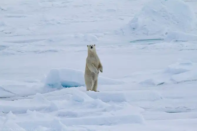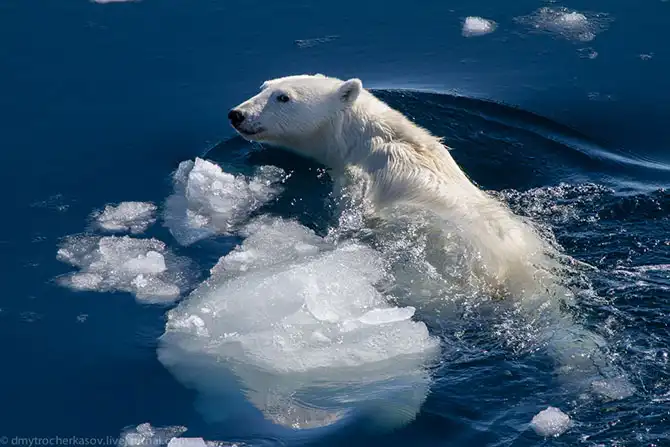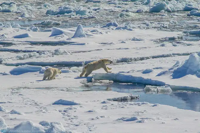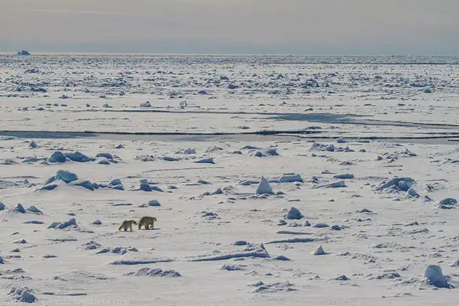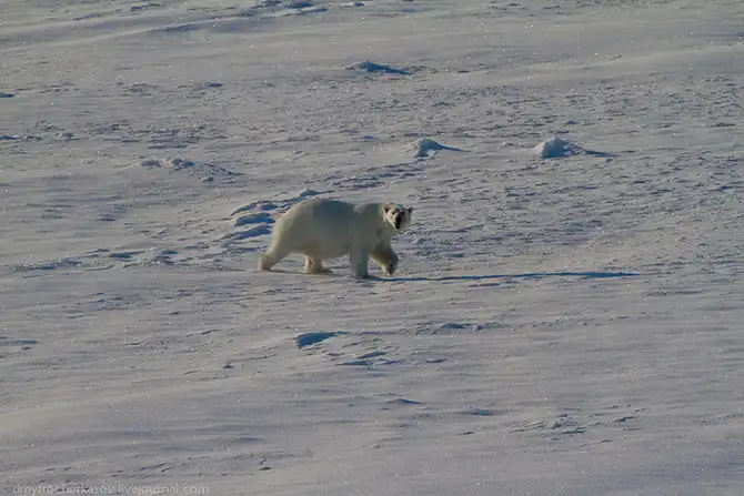Именно в этом районе мы встретили первых белых медведей. Это не удивительно. Такое сочетание льда, суши и воды — идеальная среда обитания для этого полярного хищника.