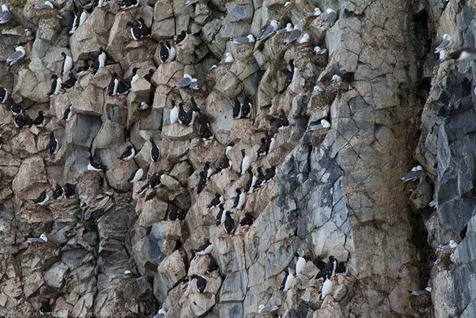 Постоянно слышно не смолкающий птичий гам. Окрестные скалы облюбовали тысячи кайр и чаек.