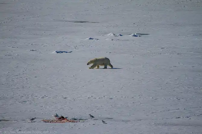 Основная добыча белого медведя это нерпа. Выслеживает он ее в основном по запаху. Очень часто нерпа прячется в вымоинах в толще льда. Показываться на поверхности слишком часто она не рискует. Белый медведь выследив нерпу со всей силы передними лапами пробивает лед и затем пытается вытащить ее наружу. Этот мишка явно опоздал. Кто-то более удачливый уже расправился с тюленем.