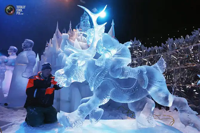 Российский участник вырезает скульптуру диснеевского персонажа на Фестивале ледяных скульптур в Брюгге, Бельгия.