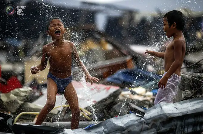 Дети купаются в разрушенном тайфуном городе Таклобан на Филиппинах.