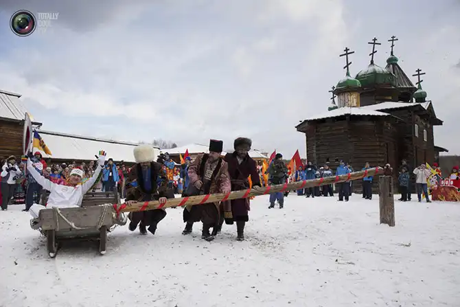 Эстафета Олимпийского огня в Этнографическом музее Тальцы в Иркутской области, Россия.