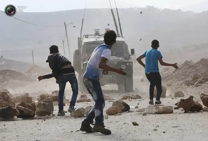 Палестинские подростки забрасывают камнями джип израильской армии во время столкновений близ Наблуса на Западном берегу реки Иордан.