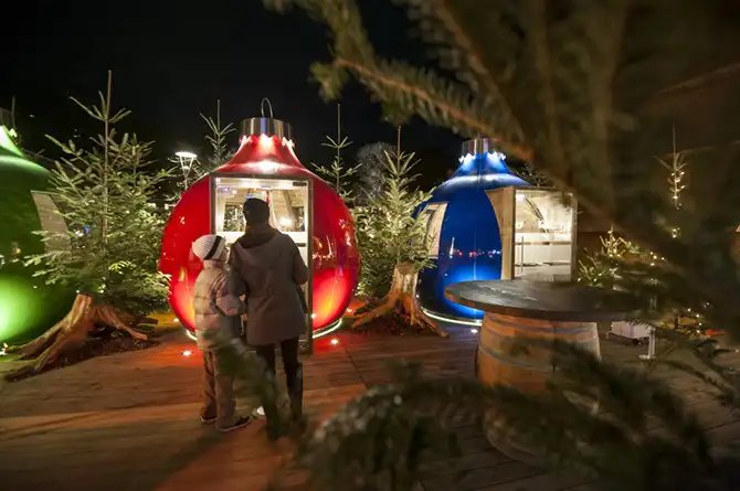 В 50 деревянных домиках продают рождественские подарки и елочные украшения, в то время как дети могут покататься на пони в парке или освоить одно из местных ремесел, курсы которых специально организованы для маленьких посетителей.