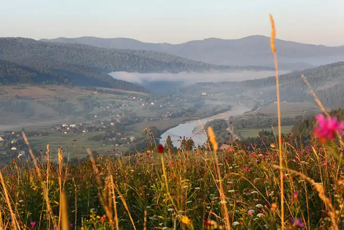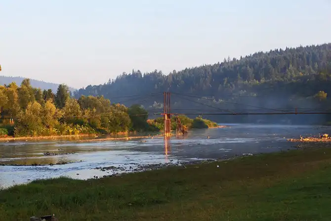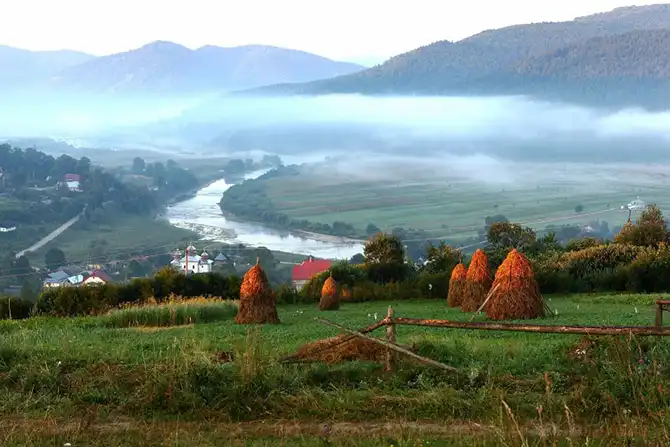 Если проехать на противоположную сторону, то можно увидеть, как вдоль реки Стрый, плавно плывет утренний туман, кутая собой село Новый Крапивник.