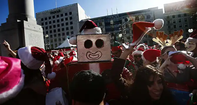 В Сан-Франциско, на территории Юнион-сквер проходили танцы Санта-Клаусов