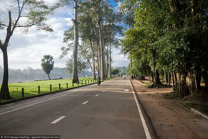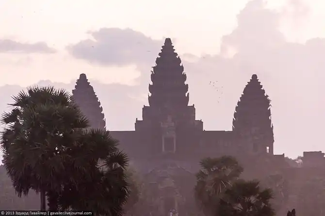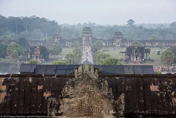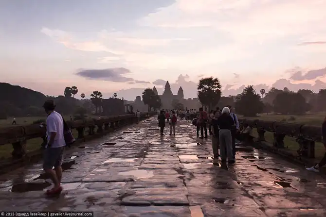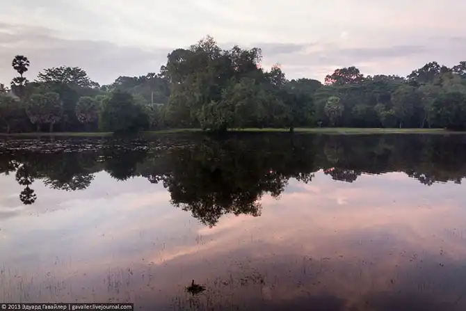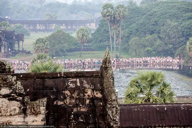 Толпы туристов приезжают сюда в 5-6 часов утра, чтобы увидеть чудо — первые лучи восходящего солнца над Ангкор-Ватом. Этот магический момент-ритуал запечатлевают отсюда: