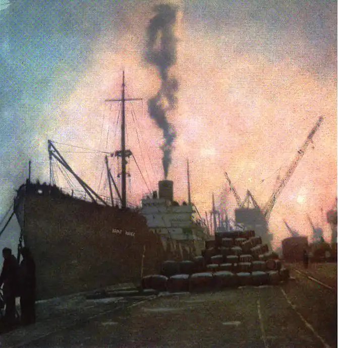 Жданов (сейчас Мариуполь), порт завода «Азовсталь» им. Орджоникидзе. Разгрузка пароходов с агломератом для доменных печей завода. Фото М. Медуховського.