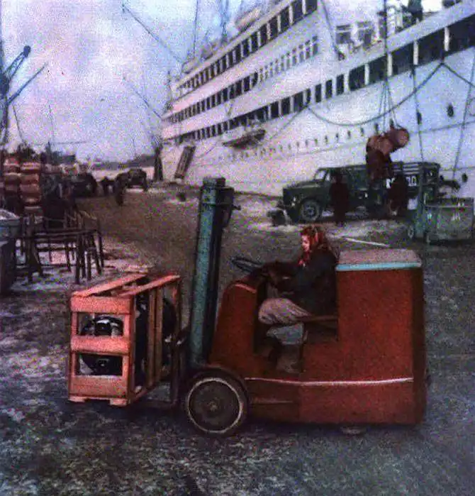 1954. Водитель электротележки Галя Боряк спешит: комсомольцы обязались разгрузить пассажирский теплоход «Победа» досрочно. Одесский порт. Фото А. Кнорринг.