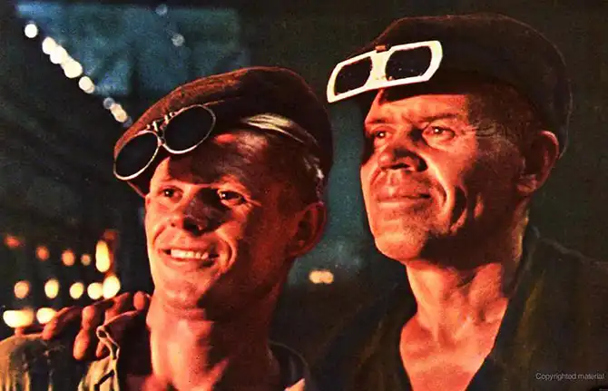 1959. Передовой сталевар завода «Азовсталь» Д. Мазалов (справа) и его помощник, воспитанник металлургического техникума Николай Луну. Фото Я. Рюмкина.