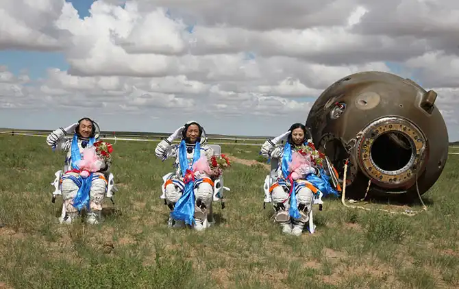 Китайские космонавты салютуют возле капсулы с Шэньчжоу после удачного приземления в Монголии.