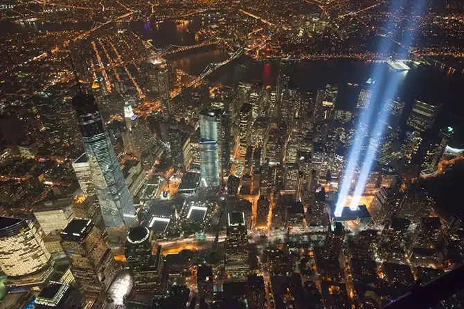 Вид на Нью-Йорк и на мемориал в день двенадцатой годовщины террористической атаки на Всемирный торговый центр 9 сентября 2013 года.