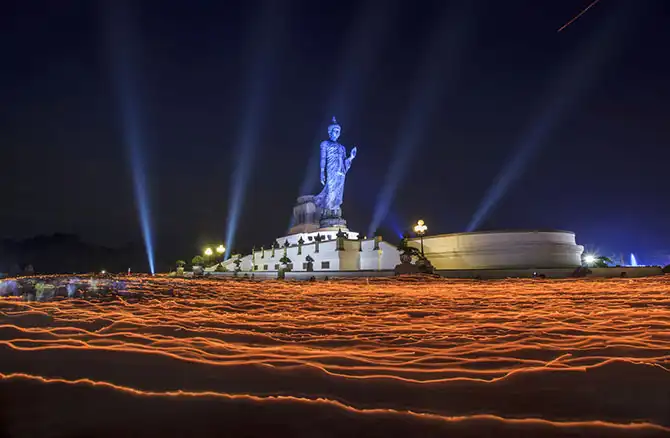 Люди несут свечи вокруг статуи Будды в День почитания Будды в Таиланде.