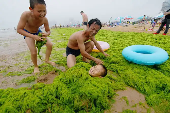 Мужчина со своим сыном в китайской провинции Циндао, где произошло небывалое нашествие зеленых водорослей. С июня с городских пляжей вывезли более 50,000 тонн водорослей.
