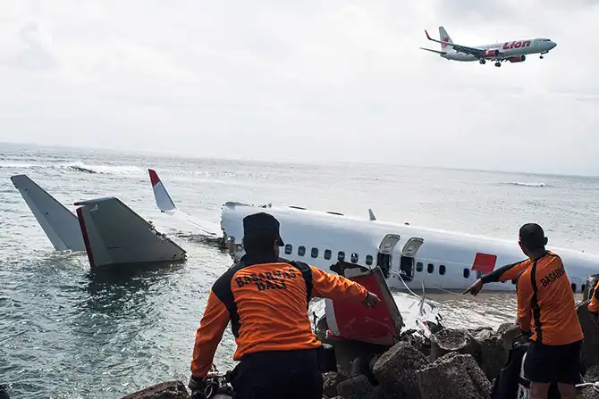 Спасательная бригада в Индонезии ищет бортовые самописцы на месте крушения самолета у берегов Бали. При заходе на посадку в международном аэропорту «Нгурах-Рай» в условиях экваториального ливня пилот промахнулся мимо полосы, и самолет упал на мелководье.