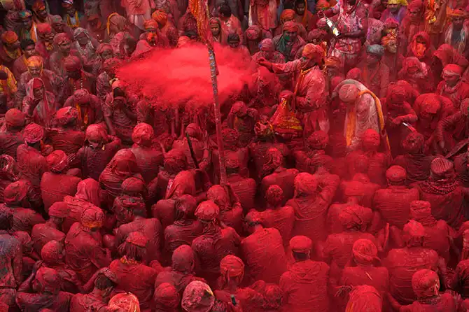Людей, собравшихся у Храма Кришны в Шриджи, поливают водой с краской. Это фестиваль — двойник праздника Холи в Барсане.
