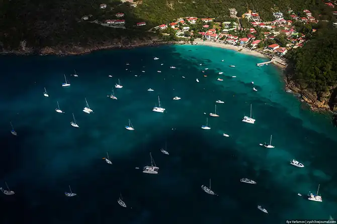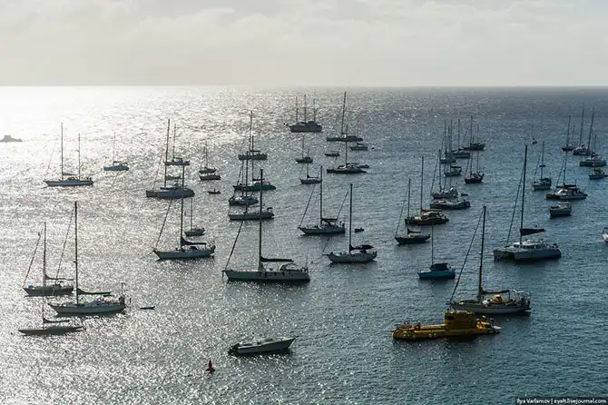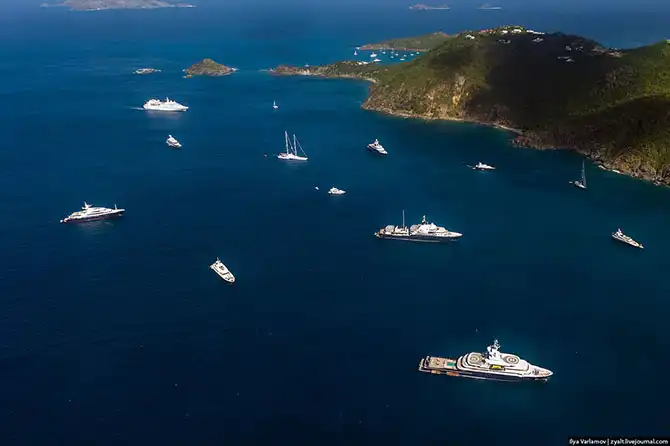 При подлете к острову сразу бросаются в глаза огромные яхты.