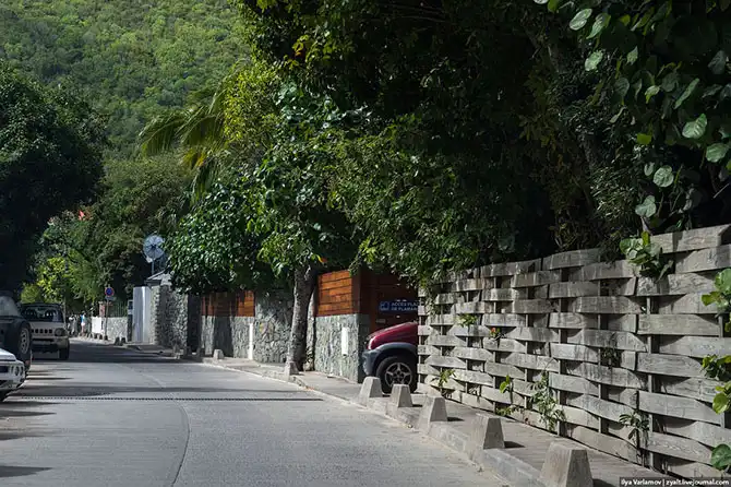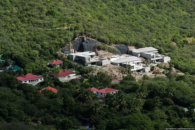 В России остров стал известен в 2009 году, когда Роман Абрамович купил 70 акров земли за пляжем Gouverneur c расположенными на ней бунгало с видами на океан, теннисными кортами, бассейнами, танцевальным и обеденным павильонами. Стоимость сделки составила почти 90 млн. долларов. Вот участок Абрамовича. Здания все небольшие и все утопает в зелени, ничего не видно с дороги.