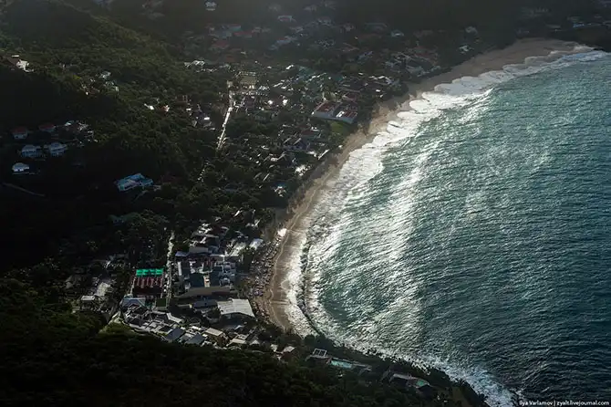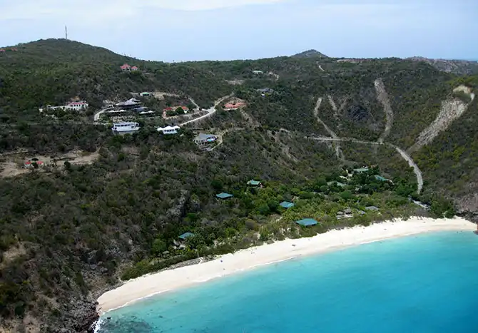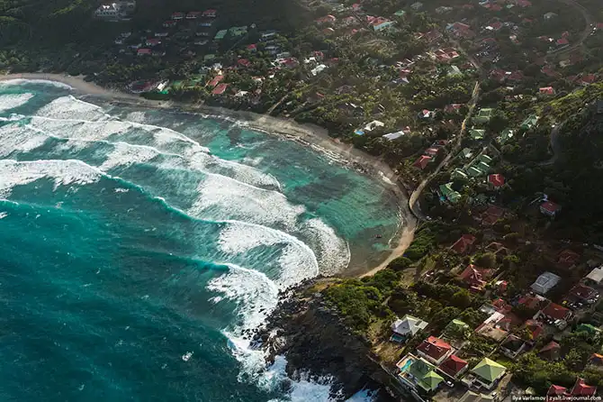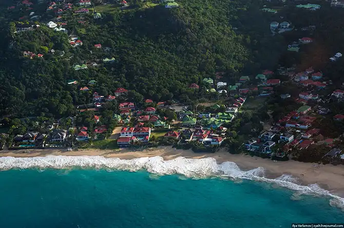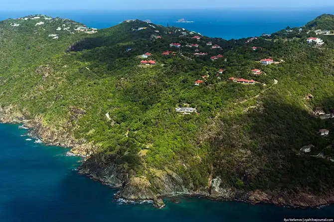 Вот вид с вертолета. Здесь видно, что зданий немного, ничего особо роскошного нет. Когда-то эта земля принадлежала Дэвиду Рокфеллеру. По закону пляжи все общественные. То есть даже Абрамович не может себе выкроить и метра общественного пляжа. Это вам не Ткачев или Якунин, которые своими дачными заборами незаконно захватили выход к воде, тут на Сен-Бартелеми перед законом все равны. Дикие люди