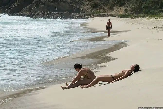 Простые люди приезжают купаться. На пляже нет даже зонтиков с лежаками.