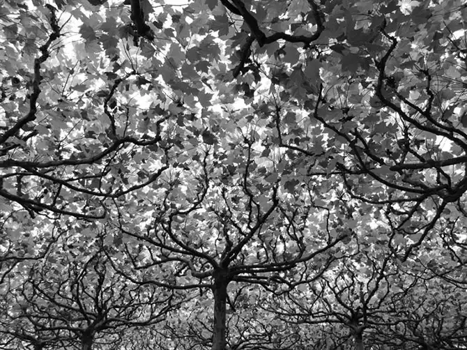 Во время посещения Еврейского музея я стоял под группой деревьев и заметил большое взаимодействие ветвей со светом, проходящим сквозь полог листвы.