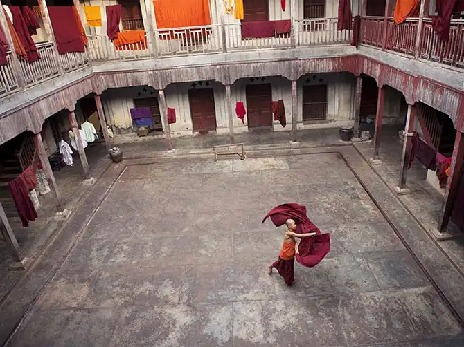 Молодой монах пересекает внутренний дворик внутри монастыря в Мандалае, Мьянма, где он живет.