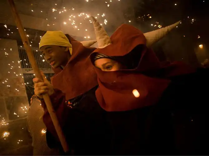 Дьяволы пробегают среди взрывов пиротехники во время празднования фестиваля Санта Рок в готическом квартале Барселоны.