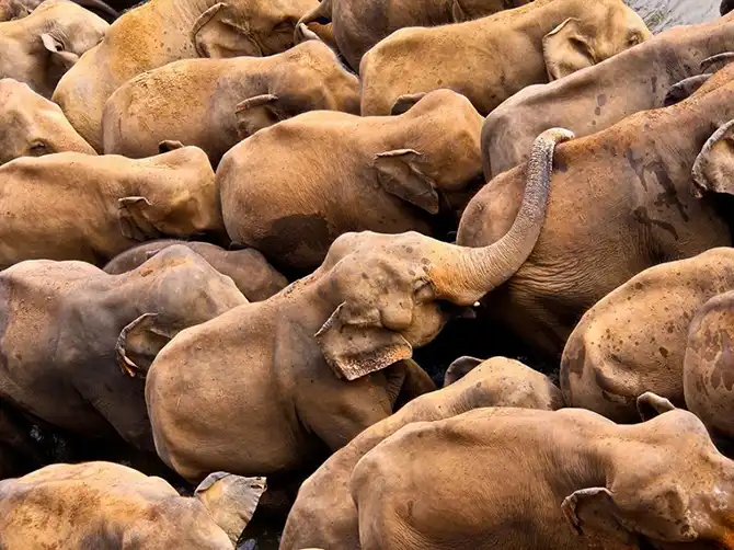 Слоны в слоновьем приюте в Пиннавала, Шри-Ланка.