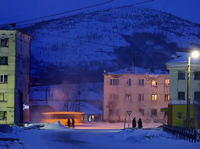 В северо-восточном российском городе Сусуман несколько человек ждут автобуса на остановке, температура на улице около минус 35 °С.