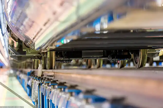 Тележка головного вагона сбоку. Слева видны катушки АЛС, они принимают из рельс высокочастотные сигналы. Так компьютер и машинист узнают, свободны ли блокучастки впереди поезда. С начала эксплуатации составов подвагонное оборудование немного усовершенствовали. В основном это касается расположения точек подвеса кабелей, защиты их и другого оборудования.