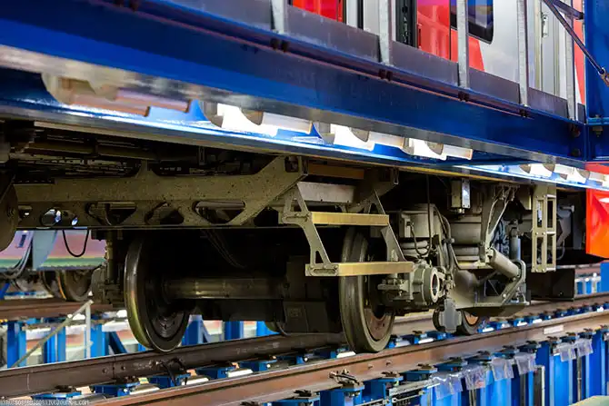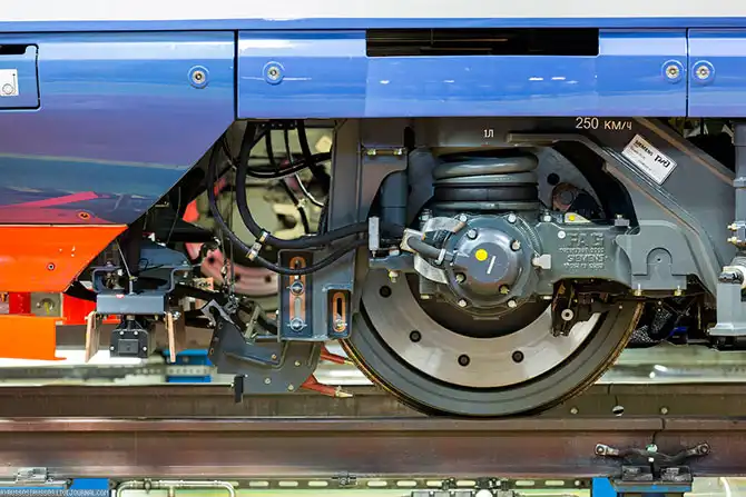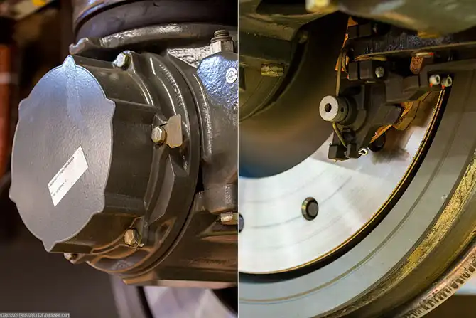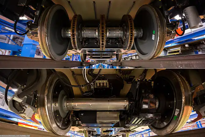 Наверху — колёсная пара прицепного вагона аж с тремя дисками тормозов, а внизу расположена колёсная пара моторного вагона. Каждая ось защищена от гравия кожухом.