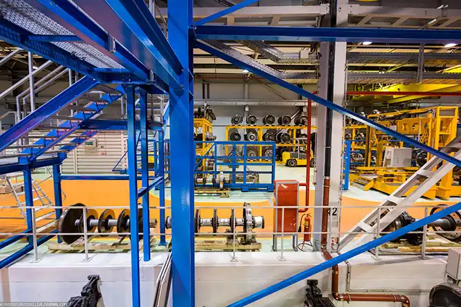 Специальный стенд для проверки собранной тележки. Здесь её прочность испытывается теми же нагрузками, что и в поезде.
