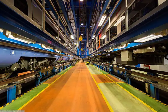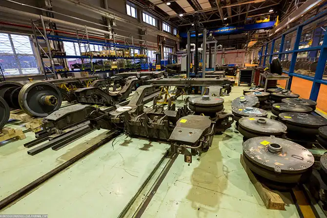 Участок сборки тележки. Справа лежат баллоны пневмоподвески. Сверху в них отверстие, через которое, пройдя полую балку, поступает воздух. На эту балку и опираются баллоны.