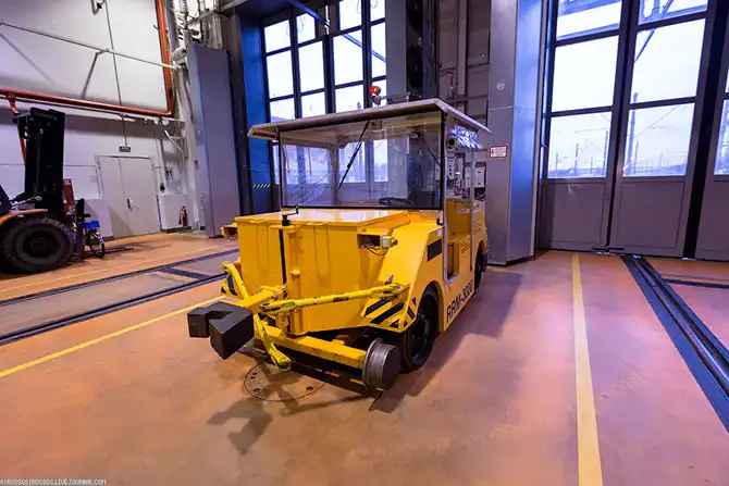 Тяговый агрегат для перемещения поездов на короткие дистанции. Боковые усы позволяют транспортировать по территории депо контейнеры с грузом.
