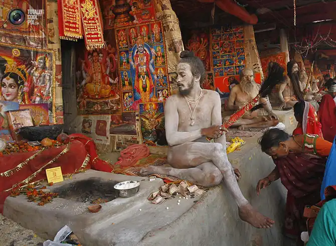 Садху благословляет женщину, которая совершила омовение в месте, где Ганг впадает в Бенгальский залив, на фестивале Макара-санкранти на острове Сагар.