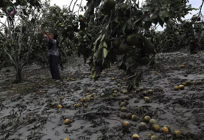 Сельская жительница собирает апельсины во время извержения вулкана Синабунг в округе Каро, Индонезия.