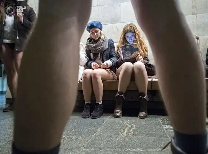 Люди принимают участие во флешмобе «В метро без штанов» в Берлине, Германия.