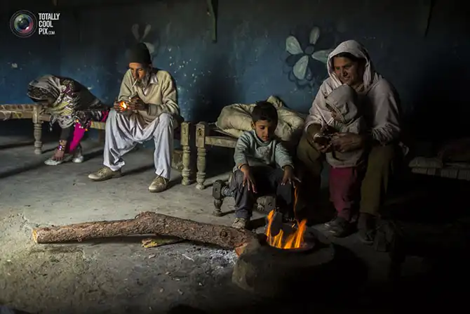 Семья сидит у очага в своём доме в Исламабаде, Пакистан.