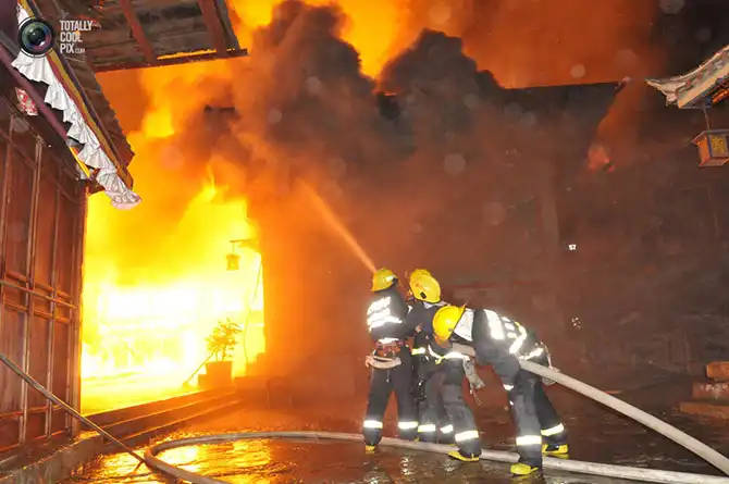 Пожарные тушат огонь в древнем городе Dukezong в уезде Шангри-Ла Дечен-Тибетского автономного округа, Китай.