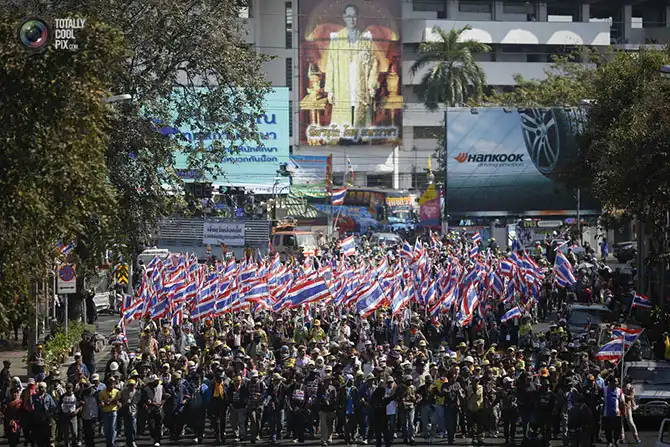Антиправительственные демонстранты идут маршем по центру Бангкока, Таиланд.