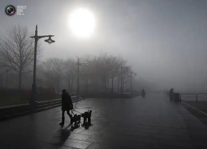 Женщина выгуливает собак на набережной реки Гудзон на Манхеттене в Нью-Йорке.