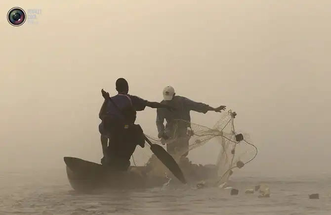 Рыбаки забрасывают сети в реку Убанги в Банги, Центральноафриканская Республика.