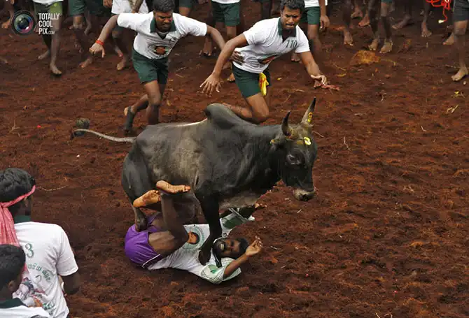 Сельский житель падает под копыта быка на фестивале на окраине города Мадурай, Индия.