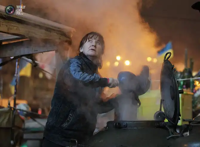 Женщина готовит чай для протестующих на Майдане в Киеве.